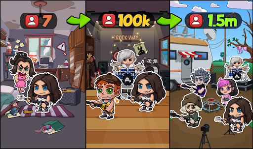Геймплей строится на найме команды, прокачке навыков, покупке гитар и усилителей, организации шоу. Механики простые: тратишь энергию на репетиции, монеты на апгрейды, фанаты приносят доход. Мод Rock Way убирает ограничения и даёт: